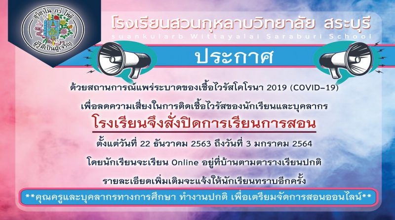ประกาศโรงเรียนสวนกุหลาบวิทยาลัย สระบุรี ประกาศแจ้งปิดการเรียนการสอน ตั้งแต่วันที่ 22 ธันวาคม – 3 มกราคม 2564 Tuesday 22 December 2020Sunday 21 March 2021 นางสาวอรณี แก้วเพิ่ม 0 Comments