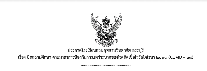 ประกาศโรงเรียนสวนกุหลาบวิทยาลัย สระบุรี ประกาศโรงเรียนสวนกุหลาบวิทยาลัย สระบุรี เรื่อง ปิดสถานศึกษา ตามมาตรการป้องกันการแพร่ระบาดของโรคติดเชื้อไวรัสโคโรนา ๒๐๑๙ (COVID – ๑๙) Tuesday 22 December 2020Sunday 21 March 2021 นางสาวอรณี แก้วเพิ่ม 0 Comments