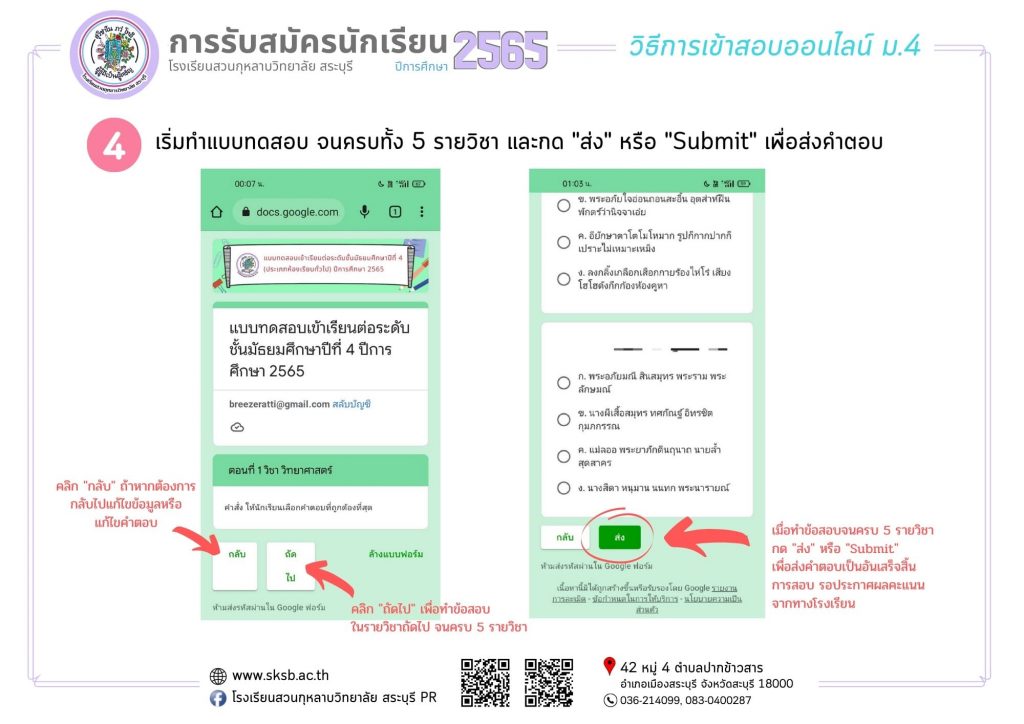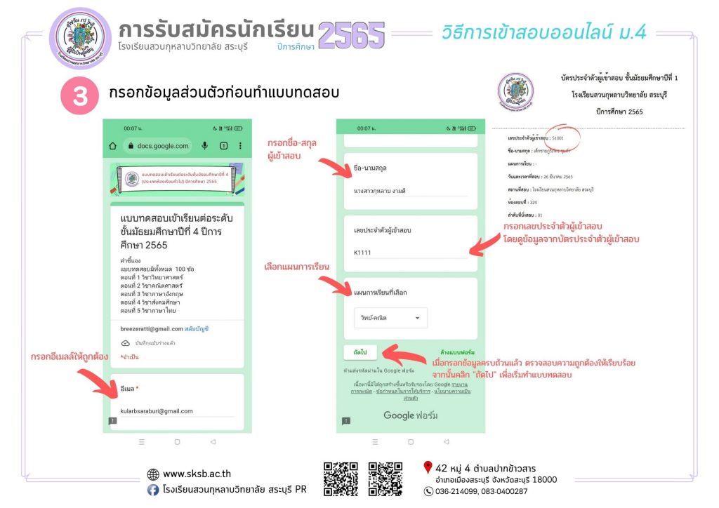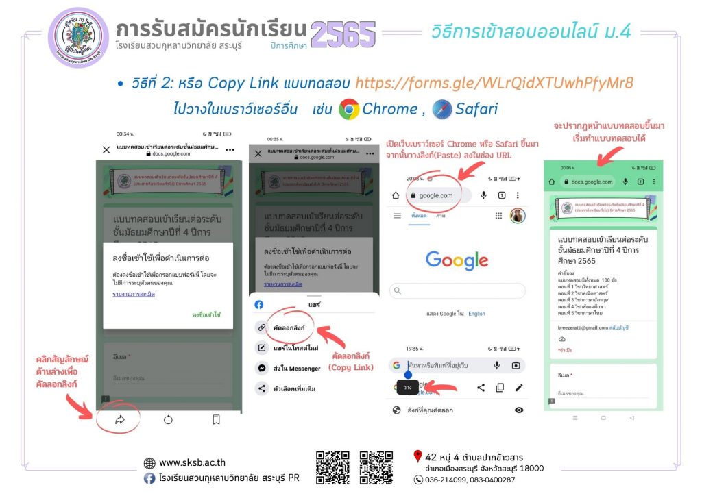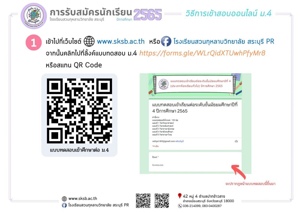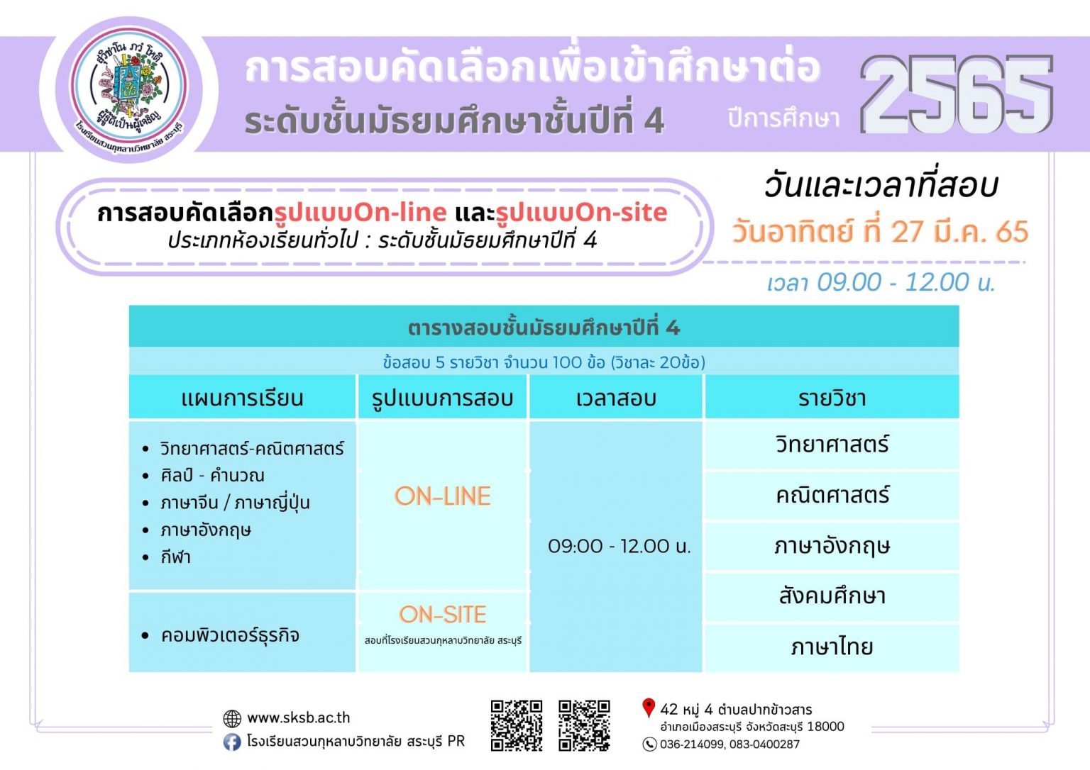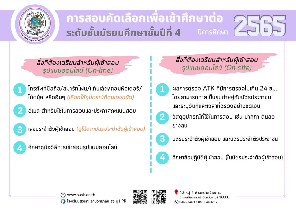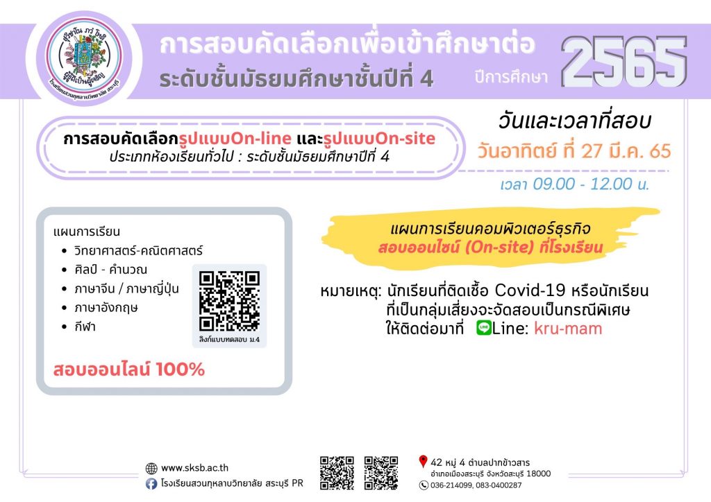 กิจกรรมอื่นๆ รอบรั้วโรงเรียนเรา เผยแพร่ผลงานทางวิชาการ การสอบคัดเลือกนักเรียนเพื่อเข้าศึกษาต่อ ชั้นมัธยมศึกษาปีที่4 (ห้องเรียนปกติ) Friday 25 March 2022Saturday 26 March 2022 ดวงพร ใจภิภักดิ์ 0 Comments การสอบคัดเลือกนักเรียนเพื่อเข้าศึกษาต่อ ชั้นมัธยมศึกษาปีที่4 (ห้องเรียนปกติ) การสอบคัดเลือกนักเรียนเพื่อเข้าศึกษาต่อ ชั้นมัธยมศึกษาปีที่ 4 (ห้องเรียนปกติ)แผนการเรียนที่สอบรูปแบบออนไลน์ มีดังนี้• วิทย์-คณิตศาสตร์• ศิลป์-คำนวณ• ภาษาจีน/ภาษาญี่ปุ่น• ภาษาอังกฤษ• กีฬา**แผนการเรียนคอมพิวเตอร์ธุรกิจ สอบออนไซน์ที่โรงเรียนวันและเวลาเดียวกันสอบวันอาทิตย์ ที่ 27 มีนาคม 2565เวลา09.00 -12.00 น.ลิ้งค์แบบทดสอบ ม.4: https://forms.gle/zf5Q6bqGsBgj9im46(เปิดระบบทดสอบตามวันและเวลาที่แจ้งดังกล่าว) ลิงค์แบบทดสอบ ม.4 <<<< คลิกตรงนี้