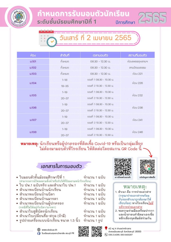 กำหนดการรับมอบตัวนักเรียน ระดับชั้นมัธยมศึกษาปีที่ 1 ปีการศึกษา 2565