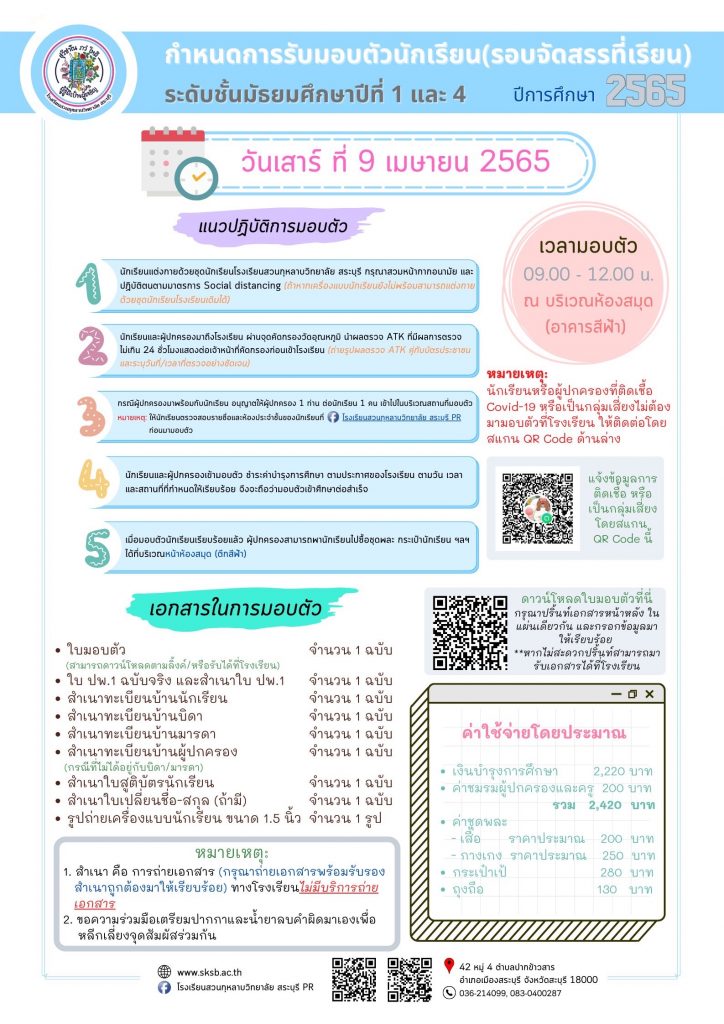 กำหนดการรับมอบตัวพื่อเข้าศึกษาต่อชั้นมัธยมศึกษาปีที่ 1 และชั้นมัธยมศึกษาปีที่ 4 ปีการศึกษา 2565 (รอบจัดสรรที่เรียน)