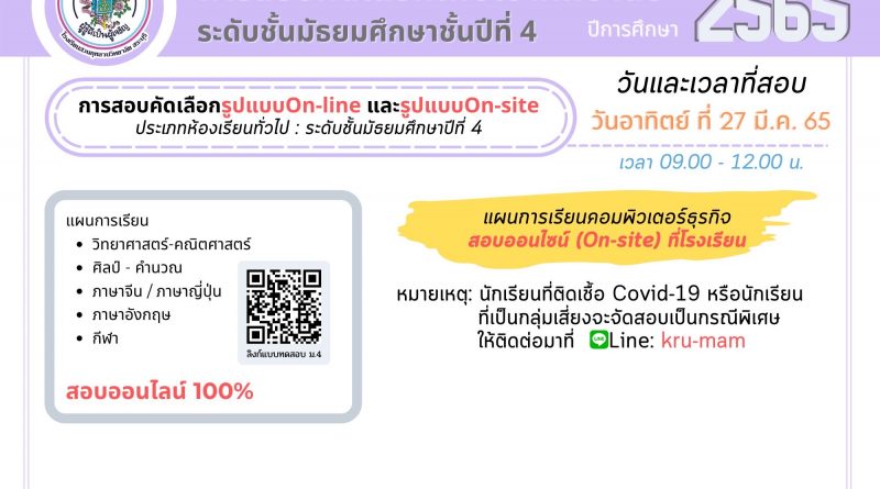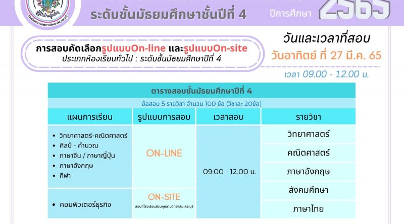 Read moreการสอบคัดเลือกนักเรียนเพื่อเข้าศึกษาต่อ ชั้นมัธยมศึกษาปีที่4 (ห้องเรียนปกติ)