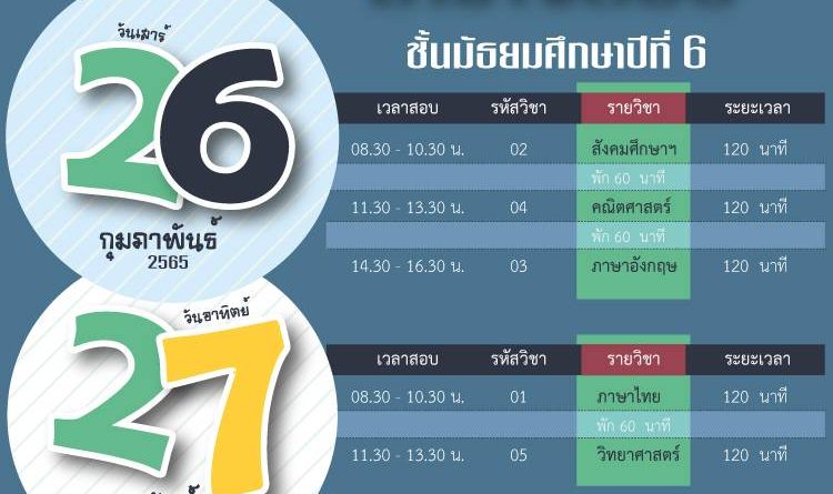 Read moreการทดสอบทางการศึกษาระดับชาติ (O-NET) ระดับชั้นมัธยมศึกษาปีที่ 6 ในวันที่ 26-27 กุมภาพันธ์ 2565